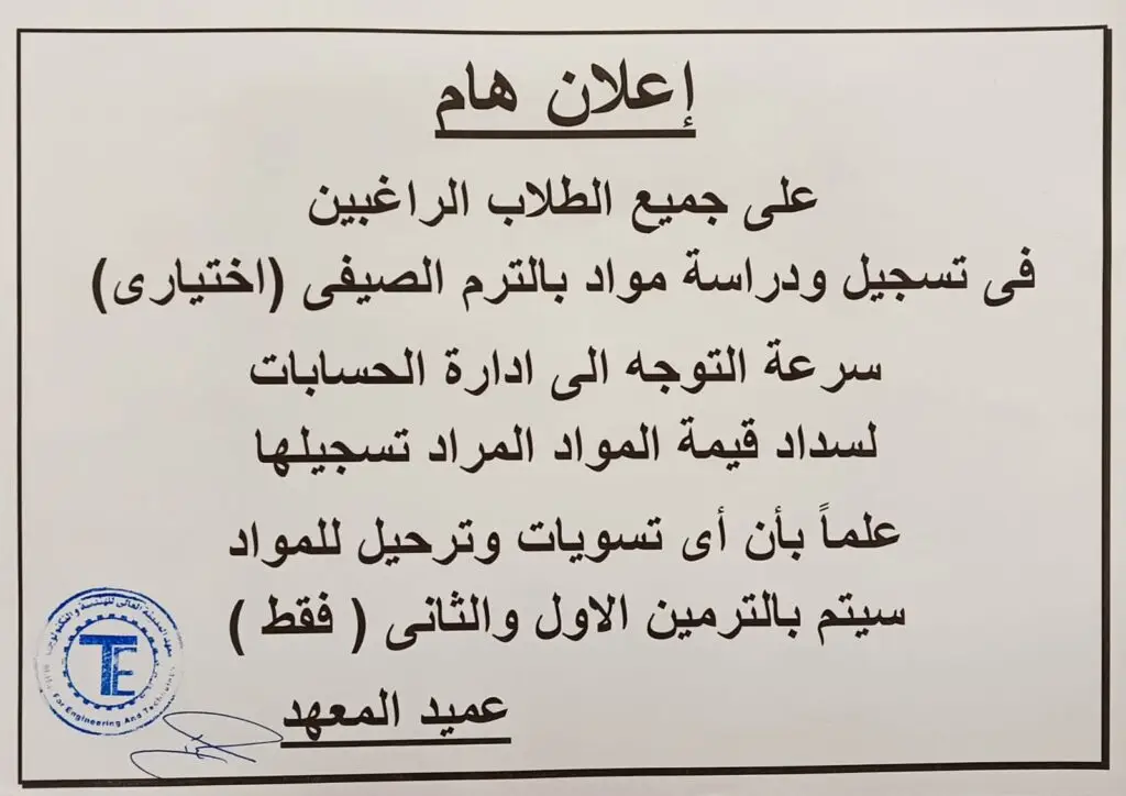 على جميع الطلاب الراغبين فى تسجيل التيرم الصيفى 2025 سرعة التوجة للحسابات admin 07/07/2025 أعلانات الطلاب تصفّح المقالات Previous Previous post: تكريم أصدقاء مكتبة معهد المدينة العالي للهندسة والتكنولوجيا من قبل عميد ووكيل المعهد ومدير المكتبةNext Next post: الجدول الدراسي للفصل الصيفى عام 2024-2025